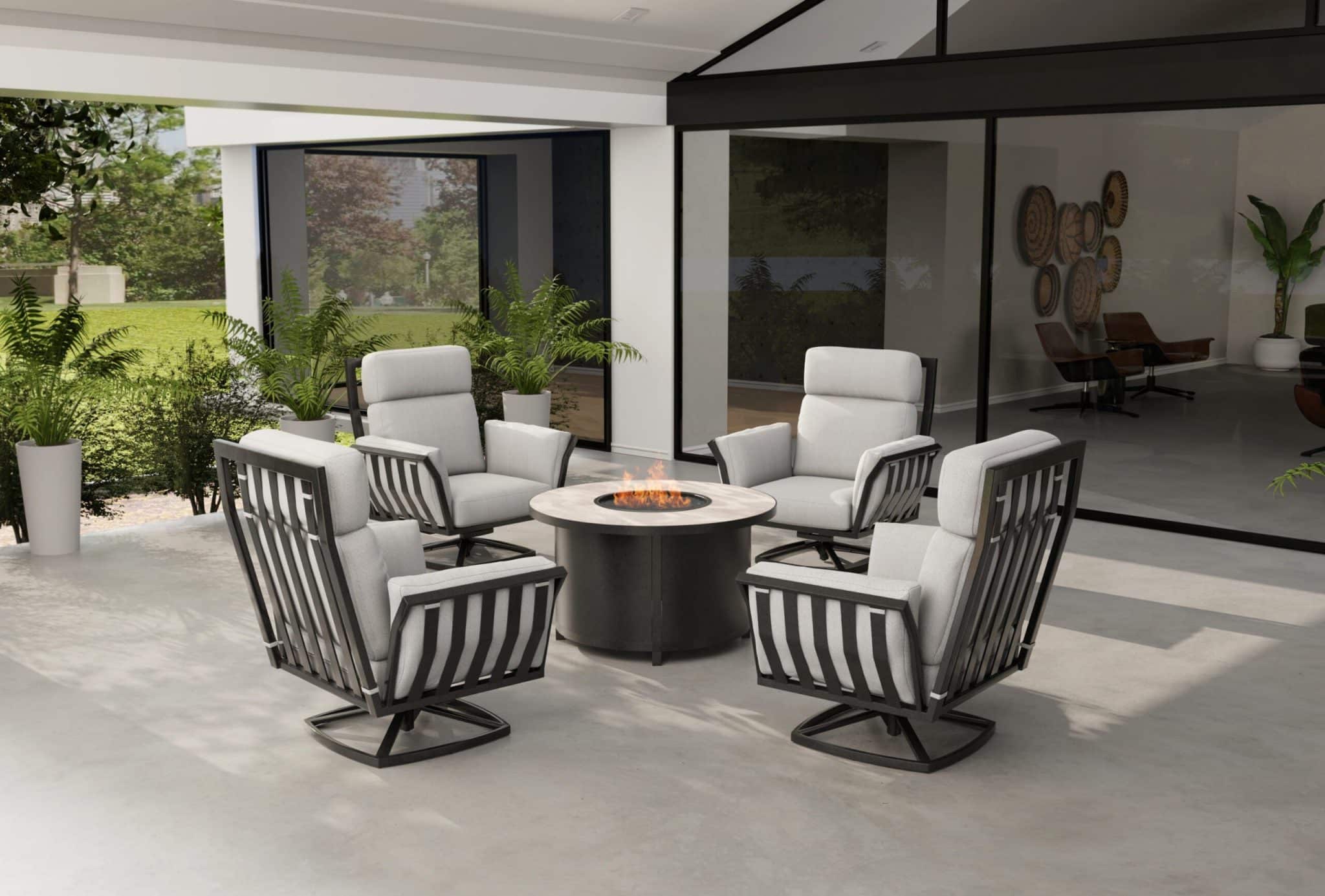The Monterra collection features unique details such as hammered rivets at key intersections and embossed flat bars that envelope the cushioning of the chair, creating beautiful and distinctly comfortable deep seating.